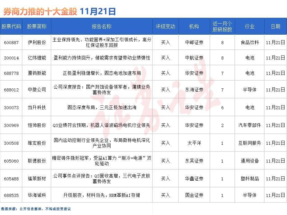 据证券之星数据库不完全统计,11月21日券商共给予超10家A股上市公司“买入”评级。从行业分布看,券商11月21日关注的个股聚焦于食品饮料、电池、半导体、汽车零部件、互联网服务、通用设备、塑料制品等行业。