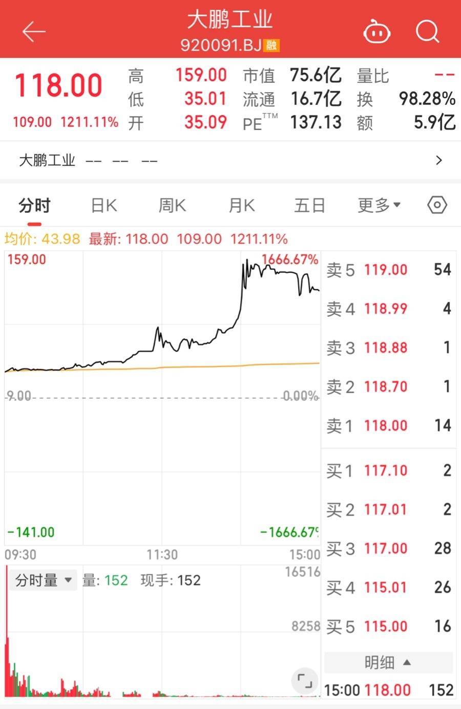 11月21日,北交所新股大鹏工业(920091.BJ)上演惊天涨幅,盘中股价最高触及159元,涨幅超过1600%,刷新年内新股首日最高涨幅纪录,盘中两次触发临时停牌。截至收盘,大鹏工业报118元/股,涨幅达1211.11%,日内换手率超98%,以发行价9元/股计算,股民中一签(100股)最高可赚1.5万元。
