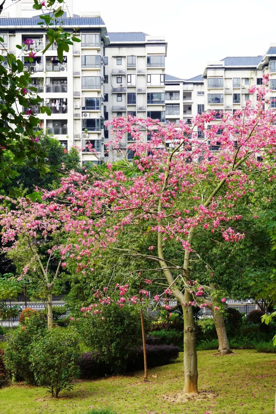 有几棵异木棉正绚烂地绽放着