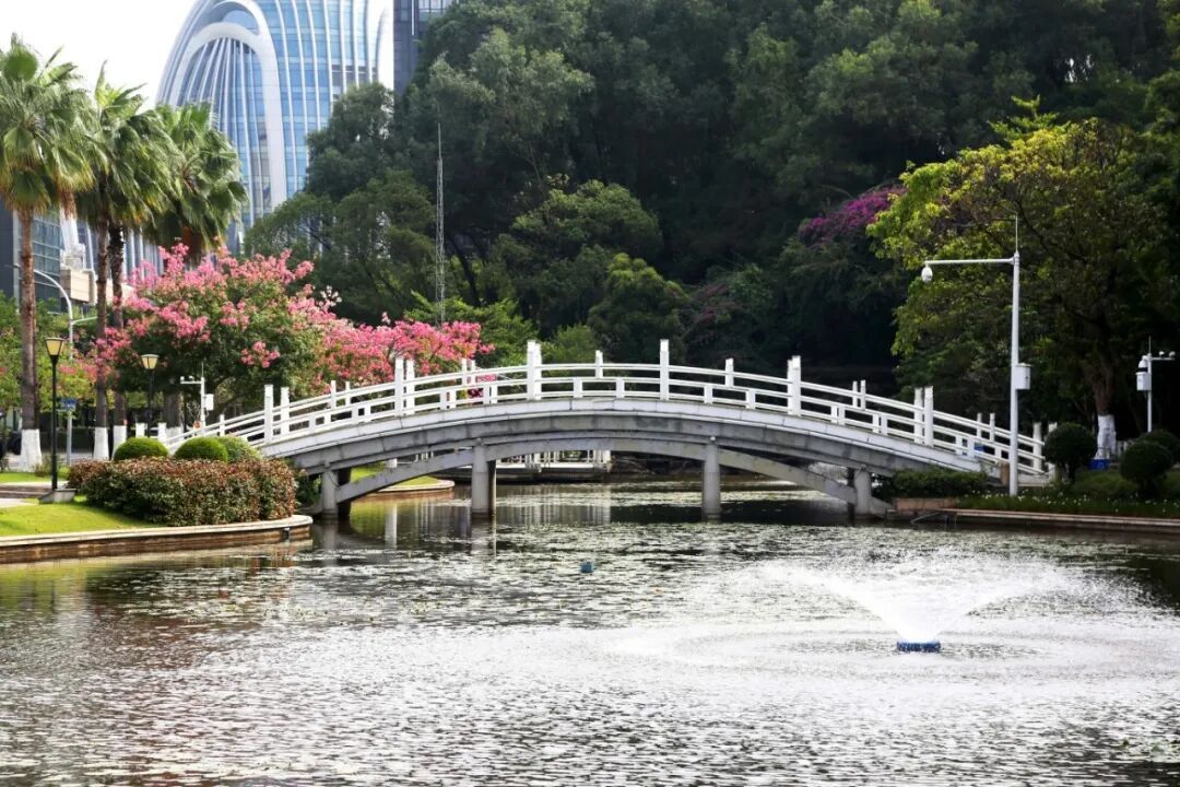 与彩虹桥上的三角梅相互交织